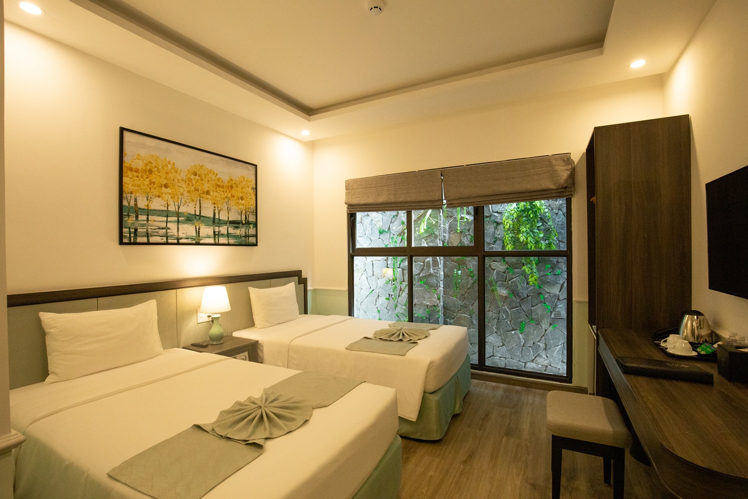 Room systems are designed in Western architectural style with harmonious colour schemes. Our rooms are equipped with 02 single beds.